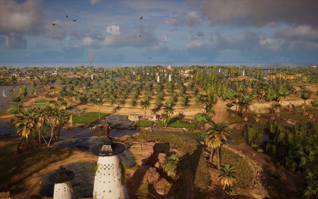 Beyond grand temples and pyramids, Assassin’s Creed: Origins shines in its depiction of Ptolemaic Egypt’s everyday architecture and activities, grounding players in the rhythms of Nile Valley life. The world feels lived-in with mud-brick villages hugging fertile fields, reed boats gliding along the Nile at sunset, and makers producing loaves beside bakeries. The houses adhere to a three-room layout and are scaled to the occupant’s status with wealthier dwellings having a more sprawling layout with gardens and décor. In contrast, Siwa Oasis village evokes Berber influences with palm-thatched roofs. Beyond the safety of the villages the landscape teems with wildlife with flocks of egrets and flamingos, hippos, crocodiles, hyenas and big cats. In some parts of the game world there are lush farmlands with barley emmer wheat, date palms, and papyrus, reflecting the “black lands” fertilized by annual floods. Ptolemaic innovations like rice and pearl millet appear, alongside tools: hoes, wing ploughs, and irrigation via shadufs (levered buckets) and sakias (animal-powered wheels). As Egyptologist Dr. Chris Naunton affirms, ‘The landscape is as it should be. The roads and hills, and even the topography is more or less accurate’—a testament to Ubisoft’s research.